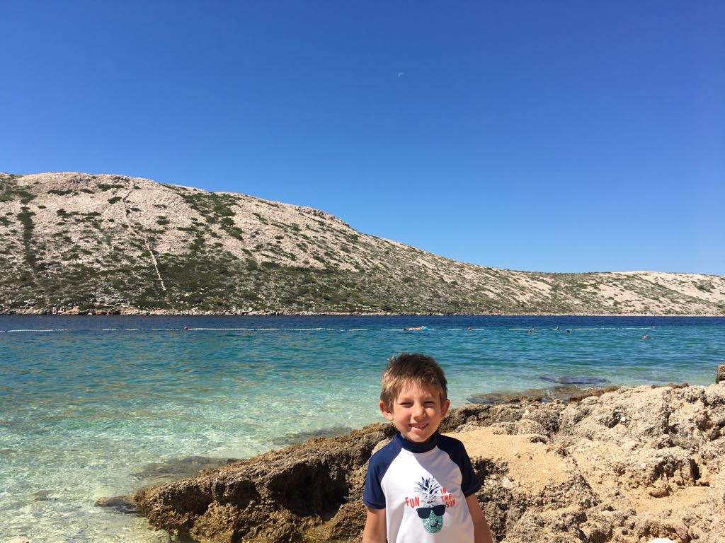 Arriving via the ten minute ferry crossing from the mainland, you might think you have arrived on the moon due to the rocky, barren terrain. Just a few minutes drive later, all is lush, green and sparkling coves. The island has one of the largest sand beaches in Croatia and that was a real gem for us and our children. Paradise Beach has soft fine sand and an impressive view of the rugged mountains on the coastline. Pebble and stone beaches are predominant in Croatia so finding a large sand beach was the icing on the cake.