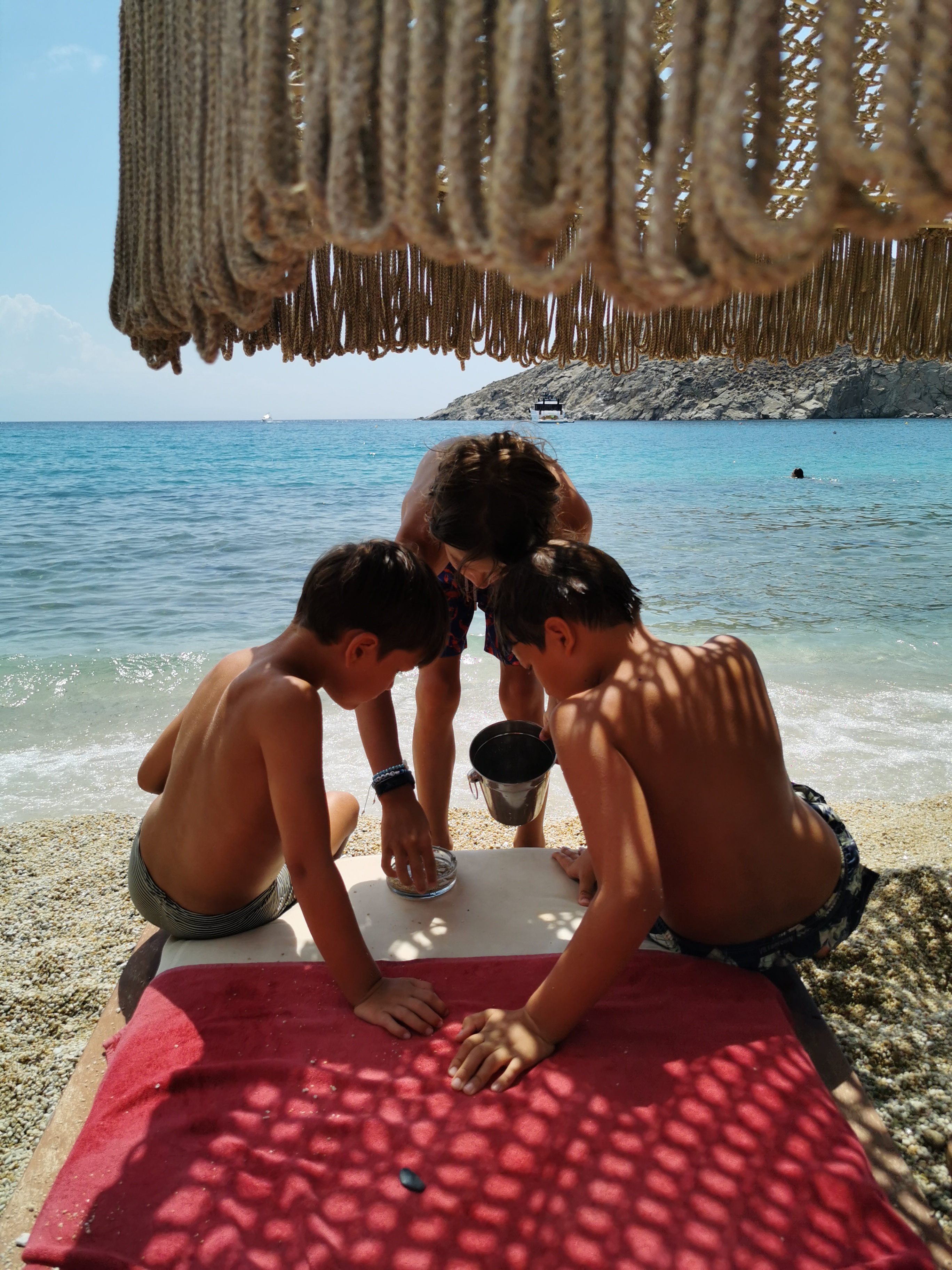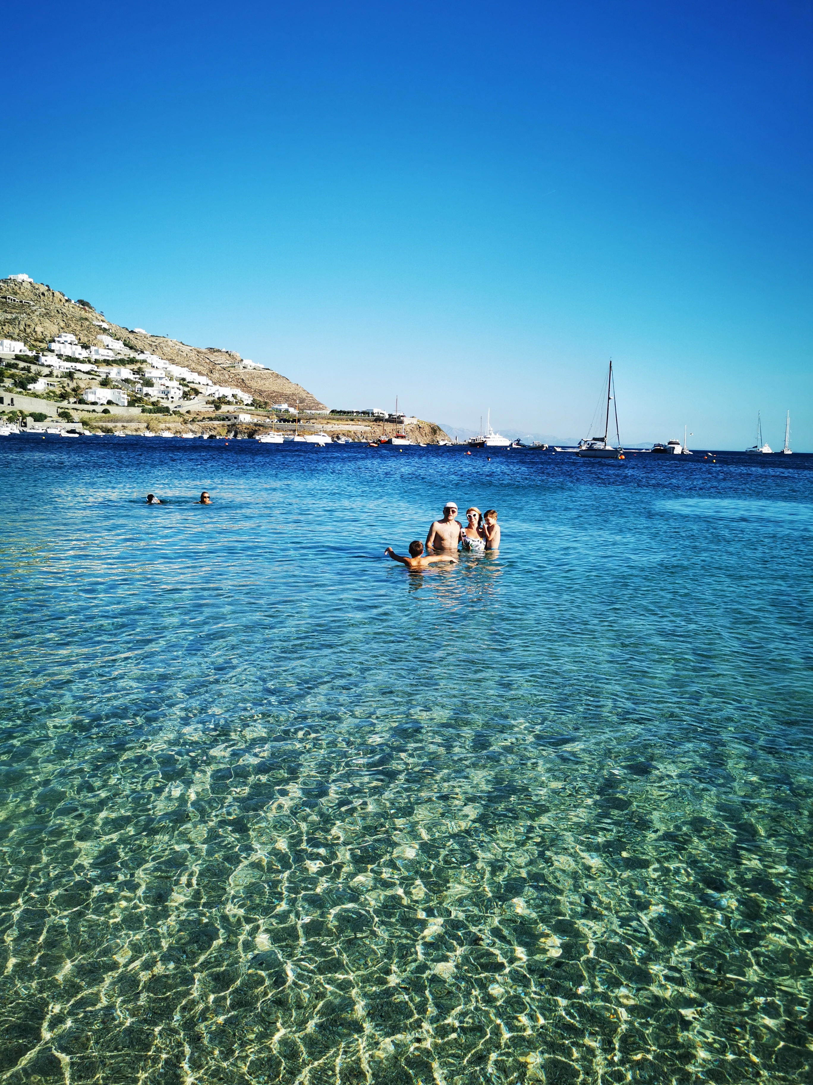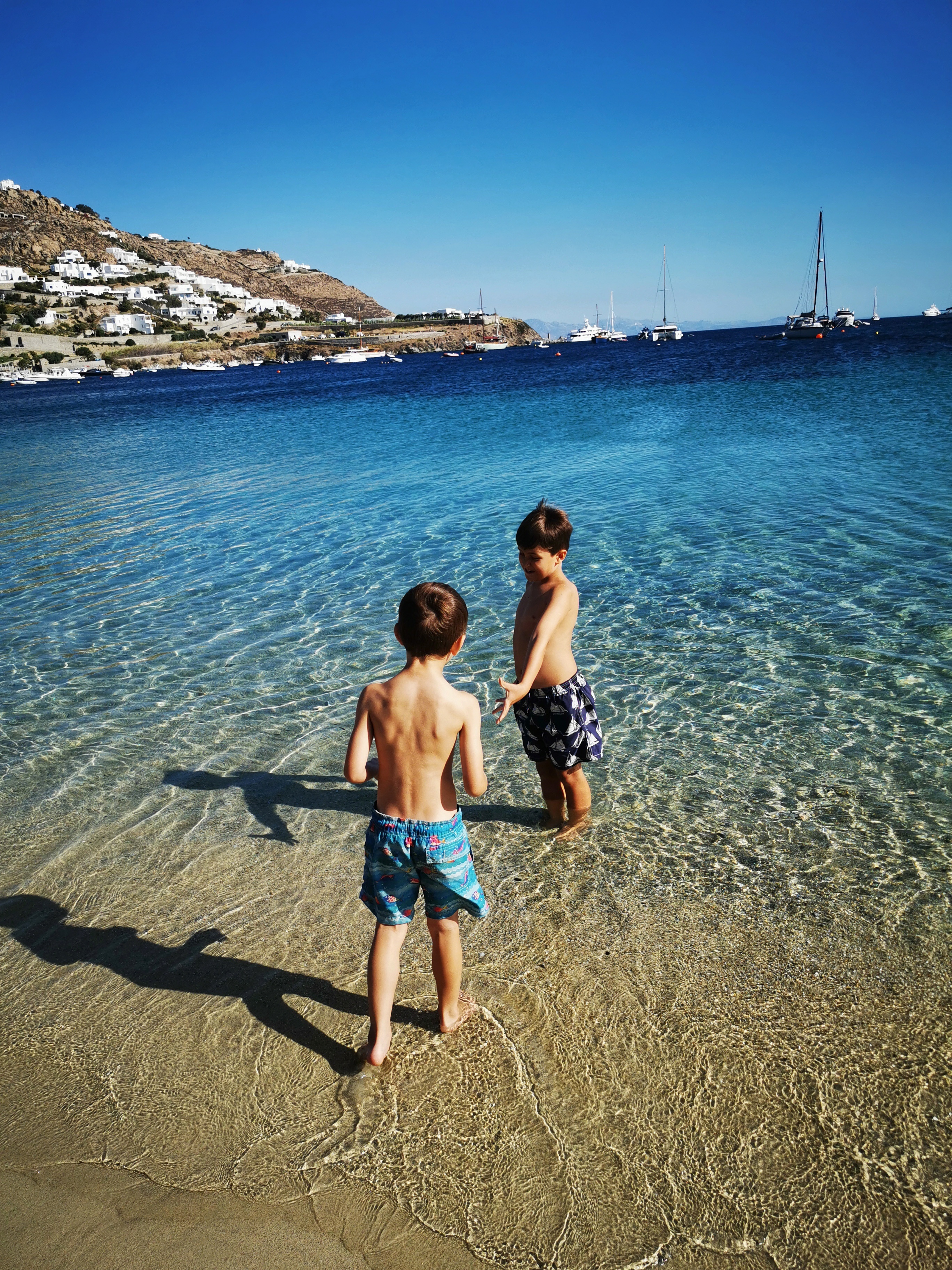 We stayed in Ornos at Villa del Sol as well as Kostantis villas, 50m away from this glorious wide beach with amazing swimming. The villas are perfect for families: Cycladic architecture with chic twists, a pool perfect for young energetic kids as well as adults. Kostantis is one of the best authentic Greek restaurants on the island (certain suggested in Greece!) and breakfasts in here and at Aperanto Galazio every day were pure delight. The Yoghurt and fresh fruit beautiful; the pastries warm and fresh, the service super graceful and friendly. Ornos beach is busy and postcard beautiful, be ready to pay Euro50 for 2 sunchairs – with our monkeys though little point as they swim most day, eat or play.